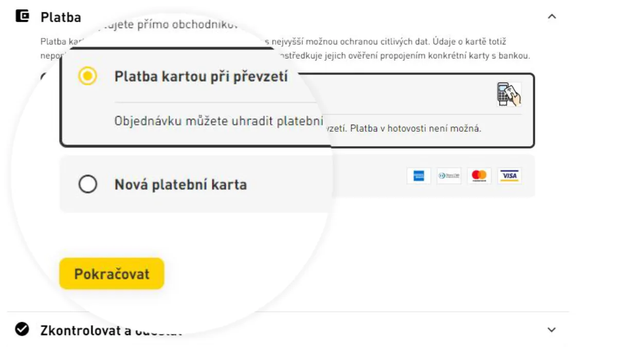Při nákupu na e-shopu můžete využít jednu ze 3 platebních metod. Objednávku můžete zaplatit online platbou při odeslání objednávky nebo platební kartou u kurýra přes terminál. Platit můžete také pomocí kreditů, které získáte při reklamaci zboží nebo nahráním BILLA dárkové karty. S nahráním dárkové karty vám rádi pomůžeme na naší zákaznické lince 800 140 000.