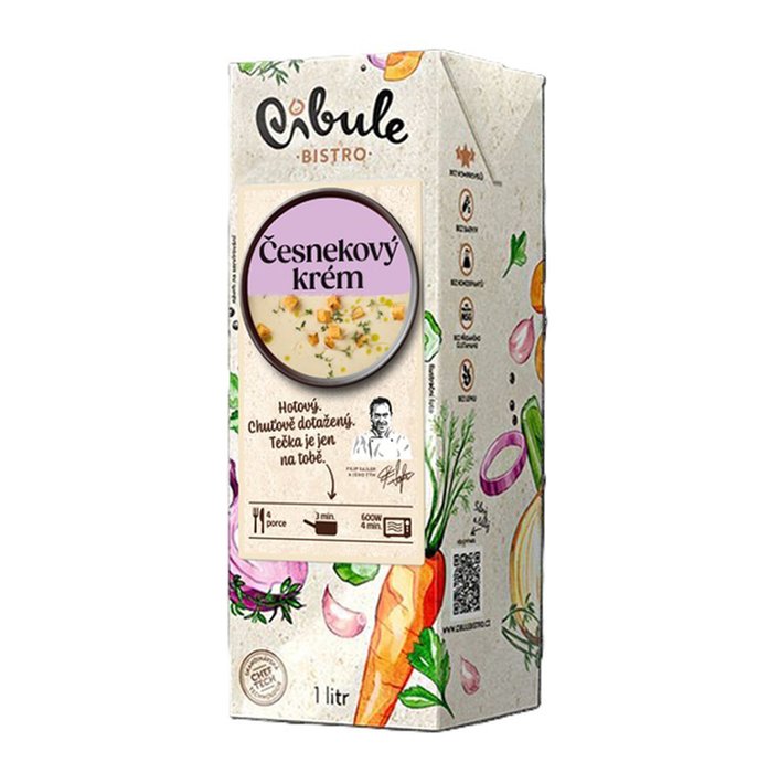 pitná voda, mléko, brambory, česnek 8 %, cibule 6 %, Cibule Bistro zeleninový vývar 5 % (pitná voda, cibule, celer, petržel, mrkev, slunečnicový olej, česnek, směs koření, rajčatový protlak, jedlá sůl), smetana, slunečnicový olej, kukuřičná mouka, máslo, mořská sůl Sa Sal z Mallorky, muškátový ořech, černý pepř. Na přípravu 1 litru zeleninového vývaru bylo použito 430 g zeleniny.