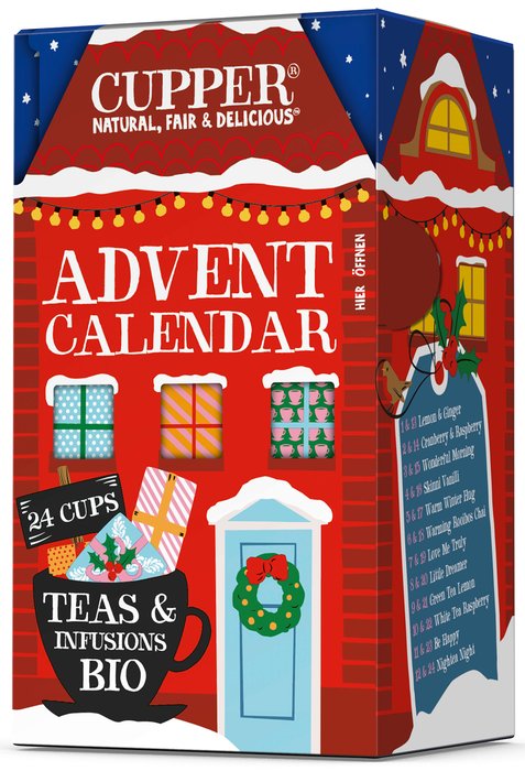 Složení: ibišek*, šípek* kopřiva*, kořen lékořice*, přírodní malinové aroma 5 %, přírodní brusinkové aroma* 3 %, kousky brusinek * 1 %, kousky malin* 1 %. 3 & 15 WONDERFUL MORNING - Bio bylinný čaj s citronovou trávou, maté a citronovou verbenou, aromatizovaný** Složení: citronová tráva* 43 %, maté * 23 %, citronová verbena* 15 %, kořen lékořice*, bílý ibišek*, přírodní citronové aroma* 4 %, citronová kůra* 2 %. Maté přirozeně obsahuje kofein. Nedoporučuje se dětem a těhotným ženám. 4 & 16 SKINNI VANILLI - Bio bylinný čaj s vanilkou, aromatizovaný** Složení: ibišek*, šípek*, kořen lékořice*, rooibos*, kakaové skořápky*, přírodní jahodové aroma* 6 %, skořice*, vanilka* 2 %, přírodní karamelové aroma* 2 %. 5 & 17 WARM WINTER HUG - Bio bylinný čaj se skořicí, badyánem a klikvou, aromatizovaný** Složení: ibišek*, skořice* 22 %, kořen lékořice*, šípek*, hřebíček*, přírodní pomerančové aroma 4 %, badyán* 3 %, pomerančová kůra*, klikva velkoplodá* 1 %, přírodní aroma černého rybízu 1 %. *z ekologického zemědělství. 6 & 18 WARMING ROOIBOS CHAI - Bio bylinný čaj s rooibosem, skořicí a zázvorem, Složení: rooibos* 52 %, skořice* 30 %, kořen zázvoru* 8 %, kardamon*, hřebíček*, černý pepř* 7 & 19 LOVE ME TRULY - Bio bylinný čaj se skořicí, zázvorem a hřebíčkem** Složení: skořice* 47 %, semena fenyklu*, kořen zázvoru* 12 %, pomerančová kůra*, kořen lékořice*, hřebíček* 3 %, kořen čekanky*. 8 & 20 LITTLE DREAMER - Bio bylinný čaj s heřmánkem, meduňkou a levandulí. Složení: heřmánek* 30 %, meduňka* 15 %, levandule* 14 %, citronová tráva*, semena fenyklu*, šípek*, máta*. 9 & 21 GREEN TEA LEMON - Bio zelený čaj s citronem, aromatizovaný Složení: zelený čaj* 93 %, přírodní citronové aroma* 6 %, citronová kůra* 1 %. 10 & 22 WHITE TEA RASPBERRY - Bio bílý čaj s malinami, aromatizovaný. Složení: bílý čaj*, přírodní malinové aroma* 6 %, kousky malin* 1 %, přírodní aroma černého rybízu. 11 & 23 BE HAPPY - Bio bylinný čaj se skořicí, zázvorem, černým pepřem, aromatizovaný** Složení: skořice* 30 %, kořen zázvoru* 25 %, kořen lékořice*, fenykl*, pomerančová kůra*, bílý ibišek*, přírodní citronové aroma* 3 %, černý pepř* 2 %, citronová kůra* 1 %. 12 & 24 NIGHTEA NIGHT - Bio bylinný čaj se skořicí, heřmánkem a meduňkou, aromatizovaný. Složení: skořice* 35 %, heřmánek* 25 %, meduňka* 20 %, rooibos*, přírodní pomerančové aroma 5 %. *z ekologického zemědělství ** Obsahuje lékořici – osoby s vysokým krevním tlakem by se měly vyvarovat nadměrné spotřeby.