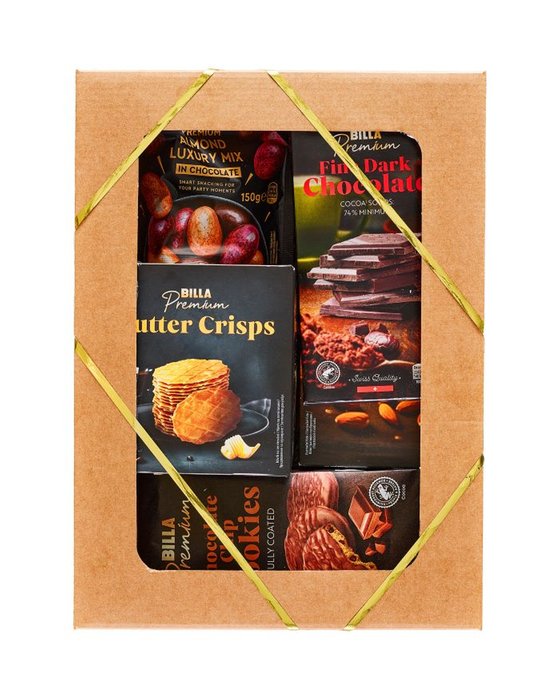 Nice Bites Mandle jádra pražená v hořké a mléčné čokoládě s perleťovým nábalem 150g, BILLA Premium Hořká čokoláda 100 g, BILLA Premium Křupavé máslové sušenky 250 g, BILLA Premium Máslovo-mandlové sušenky s kousky mandlí 175 g, BILLA Premium Sušenky s kousky hořké čokolády (14 %) máčené v mléčné čokoládě (35 %) 180.