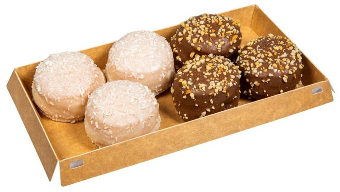 Mandlovo-kokosová náplň s příchutí 26 % [cukr, rostlinné oleje (řepkový, palmový), laktóza (z mléka), sušená sladká syrovátka (z mléka), mandle 1,5 %, emulgátor: E 322 (ze sóji); kokosový extrakt v prášku 0,9 %, aroma], pšeničná mouka, palmový tuk, bílá tuková poleva 13 % [cukr, rostlinné tuky (palmojádrový, palmový), kokosový olej, laktóza (z mléka), slunečnicový olej, emulgátor: E 322; přírodní aroma], voda, kokosové lupínky 2,6 %, cukr, dextróza (z pšenice), řepkový olej, droždí, sójová mouka, sušená syrovátka (z mléka), kypřící látky: E 450, E 500; sůl, emulgátory: E 471, E 481; sušené odstředěné mléko, prostředek na úpravu mouky: E 300; vaječný prášek, barvivo: E 160a; aroma).