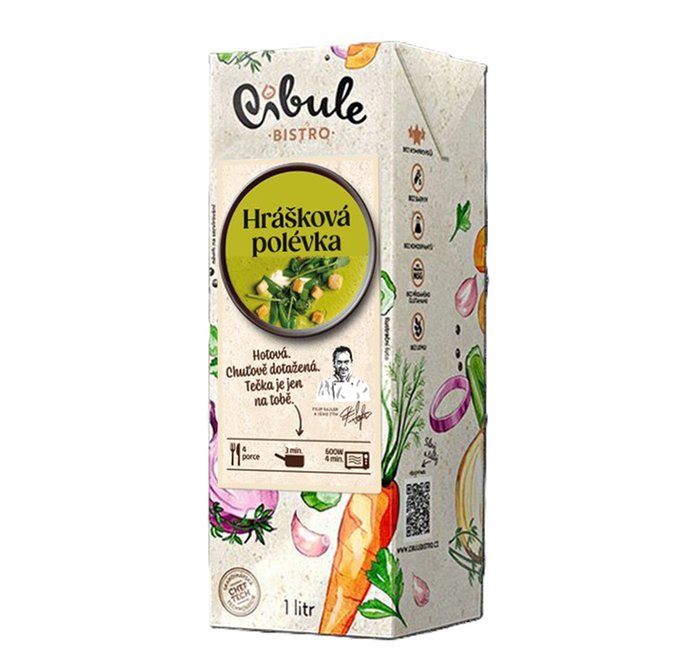 pitná voda, hrášek 24 %, brambory, smetana, Cibule Bistro zeleninový vývar 5 % (pitná voda, cibule, celer, petržel, mrkev, slunečnicový olej, česnek, směs koření, rajčatový protlak, jedlá sůl), cibule 4 %, kukuřičná mouka, máslo, slunečnicový olej, mořská sůl Sa Sal z Mallorky, česnek 1 %, muškátový ořech. Na přípravu 1 litru zeleninového vývaru bylo použito 430 g zeleniny.
