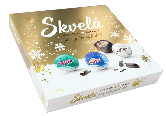 Kolekce mléčné čokolády (50%) s arašídovou (16%), kávovou (16%) a mléčnou krémovou náplní (16%).