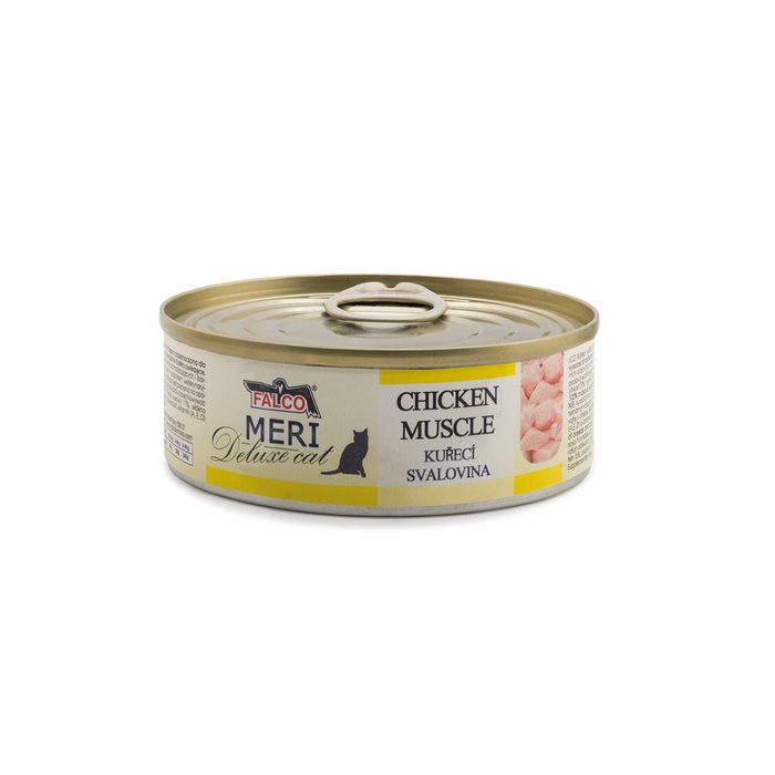 Nejlepší výběr kousků masa. Masová konzerva je naplněna ze 100 % libovou kuřecí svalovinou. Konzerva řady MERI má vynikající nutriční a dietní hodnoty, vysoký obsah hořčíku, který ovlivňuje správnou funkci svalů a nervů, dále pak obsahuje sodík a vápník, jenž příznivě působí na zpevňování kostí v kloubech. Vše je v přírodní formě. Obsahuje kuřecí svalovinu, které mají vysoký obsah esenciálních aminokyselin, železa a vitamínu B2. Dále obsahuje proteiny, jenž působí na růst svalů. Podporuje žvýkací svalstvo a je vynikající na kondici i srst. FALCO konzervy mají trvanlivost 3 roky.
