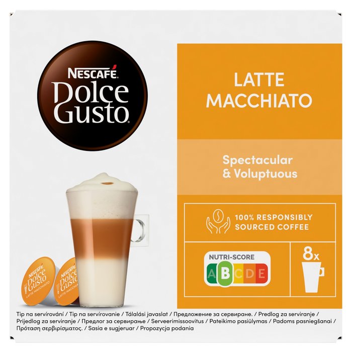 Objevte senzační NESCAFÉ® Dolce Gusto® Latte Macchiato. Tato tříbarevná italská ikona je mléčnější než cappuccino a je složená z horkého mléka, jemné kávy a bohaté mléčné pěny. Naši talentovaní tvůrci dovedli dvoukapslový recept NESCAFÉ® Dolce Gusto® Latte Macchiato k dokonalosti: jedna kapsle je pro espresso - speciální směs prvotřídních jemných jihoamerických zrn kávy arabika z Brazílie a Kolumbie a zrn kávy Robusta z Vietnamu - a jedna na napěněné mléko s trochou cukru (méně než kdykoliv před tím), nyní ještě s bohatší jemnou mléčnou pěnou díky vylepšené technologii naší kapsle.