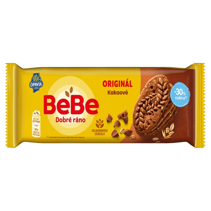 Lahodné kakaové potěšení s čokoládovými kousky a sníženým obsahem cukru Upečeny s 5 celozrnnými cereáliemi pšenice, ovsa, ječmene, špaldy a pohanky nebo žita Cereálie jsou ingrediencí číslo 1 skvělý zdroj vlákniny. Zajistí energii během dne. Dopřejte si lahodnou svačinku kdykoliv během dne a nalaďte se na pozitivní vlnu s BeBe Dobré Ráno! Užijte si BeBe jako součást vyvážené snídaně: 4 sušenky BeBe Dobré Ráno + mléčný výrobek + ovoce + čaj. Přidané minerální látky, jako je vápník, hořčík a železo.