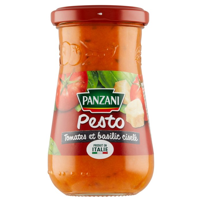 Rajčatový koncentrát 24 %, Slunečnicový olej, Drcená rajčatová dřeň 18 % (rajčata 12 %, rajčatové pyré), Voda, Sušená rajčata 5 %, Sýr Grana Padano CHOP (mléko, vejce) 5 %, Drcené kešu ořechy (ořechy), Cukr, Sůl, Bazalka 1,5 %, Červená paprika, Přírodní aroma (mléko), Antioxidant: kyselina askorbová, Regulátor kyselosti: kyselina mléčná