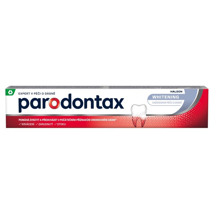 Zubní pasta ke každodennímu použití s obsahem fluoridu pro zdravější dásně a silnější zuby. Základem zdravých zubů jsou zdravé dásně. Zdravé dásně nekrvácí. Stopy krve, které zaznamenáte při čištění zubů či mezizubních prostor, mohou být příznakem onemocnění dásní. Pokud tento stav zanedbáte, může to vést k zápachu z úst, zarudnutí a otoku dásní, postupem času k ústupu dásní, uvolnění zubu, a nakonec až ke ztrátě zubu. Zubní pasta parodontax je speciálně navržena k fyzickému odstranění příčiny krvácení dásní. To napomáhá eliminovat bakterie množící se podél linie dásní, a tím udržovat dásně pevně přiléhající k zubům. Zároveň napomáhá posilovat zuby a osvěžuje dech. Zubní pasta parodontax Whitening jemným odstraňováním povrchových skvrn obnovuje přirozenou bělost zubů. Pomáhá zastavit a předcházet krvácení dásní*. *parodontax je zubní pasta ke každodennímu použití s obsahem fluoridu, která pomáhá zastavit a předcházet krvácení dásní při pravidelném používání 2x denně.