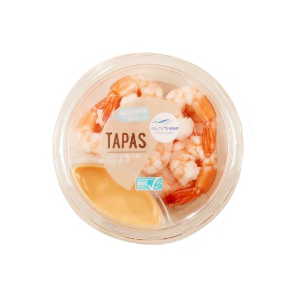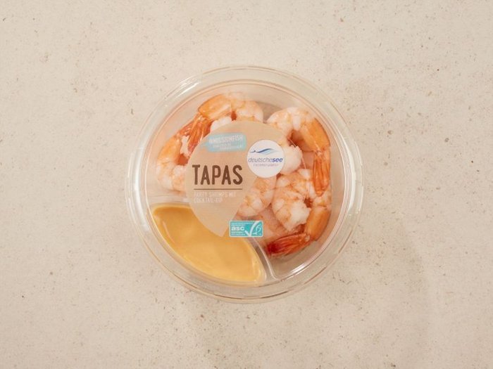70 % KREVET (96 % KREVET, jedlá sůl, regulátory kyselosti/kyseliny: kyselina octová, kyselina mléčná, kyselina citronová; antioxidant: DISIŘIČITAN SODNÝ), 30 % Koktejlový dip (Řepkový olej, voda, rajčatový protlak, cukr, VAJEČNÝ ŽLOUTEK, lihový ocet, 1,5 % vinný destilát, modifikovaný kukuřičný škrob, jedlá sůl, koření, HOŘČIČNÁ SEMENA, kurkuma, kořenové extrakty, pomerančová šťáva, zahušťovadlo: xanthan, aroma).
