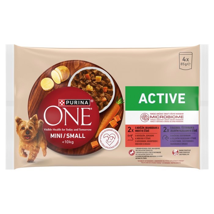 Krmný návod: Doporučené denní krmné dávky: Střední aktivita: Hmotnost psa 1-5 kg: 1 3/4 - 5 1/2 kapsiček, Hmotnost psa 5-10 kg: 5 1/2 - 8 1/2 kapsiček; Vysoká aktivita: Hmotnost psa 1-5 kg: 2 - 6 1/4 kapsiček, Hmotnost psa 5-10 kg: 6 1/4 - 9 3/4 kapsiček. Purina ONE MINI/SMALL Active* granule je možné kombinovat s kapsičkami Purina ONE ® MINI/SMALL Active*: Střední aktivita: Hmotnost psa 1-5 kg: 1-3 kapsičky, 20-55 g granulí, Hmotnost psa 5-10 kg: 3-5 kapsiček, 55-80 g granulí; Vysoká aktivita: Hmotnost psa 1-5 kg: 1-3 kapsičky, 25-70 g granulí, Hmotnost psa 5-10 kg: 3-5 kapsiček, 70-110 g granulí.