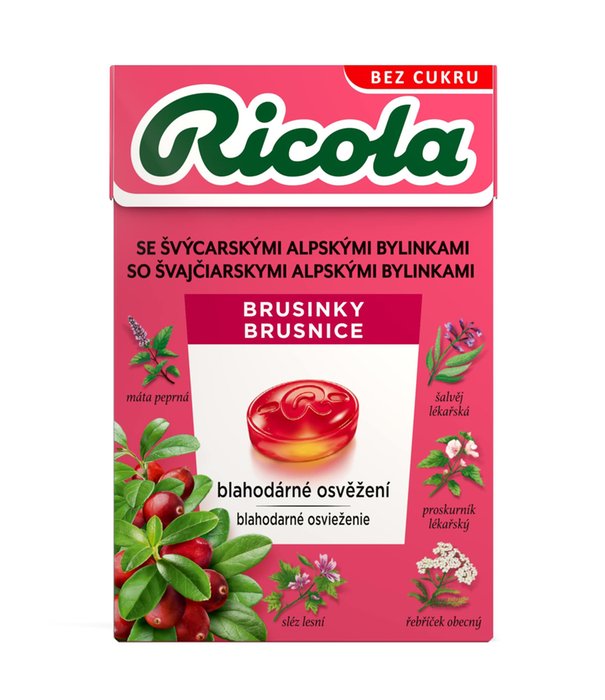Sladidlo (isomalt), kyselina (kyselina citronová), koncentrovaná šťáva (0, 6 %) z amerických brusinek (Vaccinium macrocarpon Aiton), výtažek (0, 5 %) ze směsi 13 Ricola bylin, sladidlo (steviol-glykosidy), koncentrovaná šťáva z aronie, přírodní brusinkové aroma s jinými přírodními aromaty, mentol, přírodní aromata