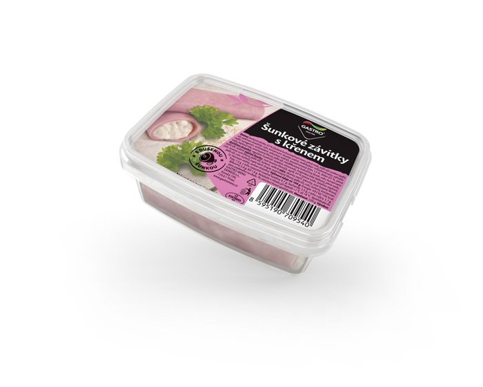 šunkové závitky 50% [dušená šunka 20% (vepřové maso, pitná voda, jedlá sůl, cukr, konzervant: dusitan sodný, stabilizátor: trifosforečnany, zahušťovadlo: karagenan, antioxidant: askorban sodný), majonéza (řepkový olej, pitná voda, modifikovaný bramborový škrob, stabilizátory: guma guar, xanthan; jedlá sůl, sušené vaječné žloutky, ocet kvasný lihový), konzervovaný křen 7, 5% (křen 75%, pitná voda, řepkový olej, ocet kvasný lihový, cukr, jedlá sůl, zahušťovadlo: modifikovaný kukuřičný škrob, regulátor kyselosti: kyselina citronová, konzervant: disiřičitan draselný)], aspik (pitná voda, želatina vepřová, cukr, ocet kvasný lihový, jedlá sůl, koření, konzervanty: sorban draselný), vařené vejce, sterilovaná zelenina (okurky, červená paprika, pitná voda, cukr, ocet kvasný lihový).