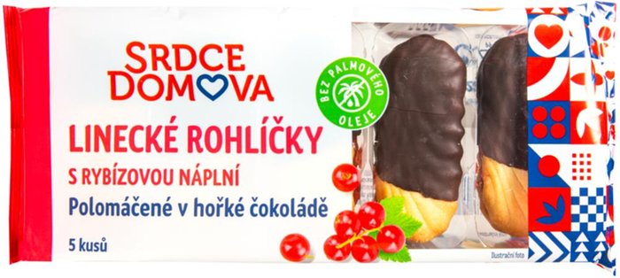 Linecké rohlíčky s náplní (22 %) s červeným rybízem, polomáčené v hořké čokoládě (15 %). Jemné pečivo s ovocnou náplní.