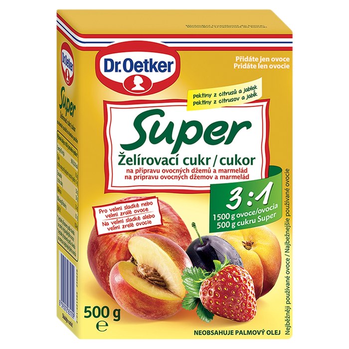 Želírovací cukr super 3:1 pro přípravu marmelád, džemů a želé zachovává výraznou chuť ovoce a je vhodný pro všechny, kteří chtějí šetřit kalorie. Jedno balení vystačí na 1 500 g ovoce a vaří se pouze 5 minut. Tento výrobek doporučujeme používat při přípravě džemů s velmi sladkým nebo velmi zralým ovocem. Se Želírovacím cukrem Super 3:1 bude Váš hotový džem obsahovat 75% ovoce!