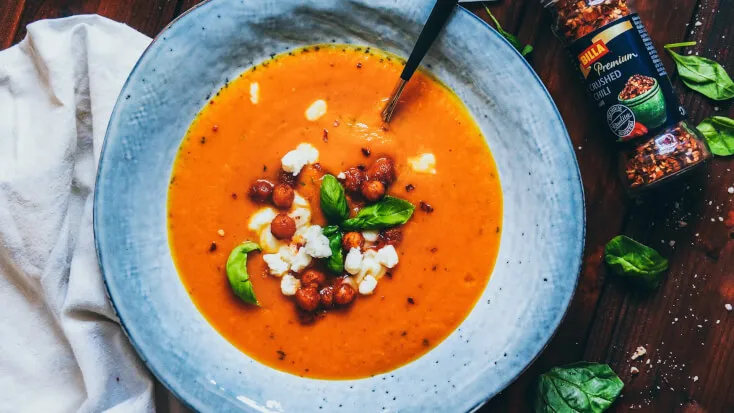 Potřebujete pořádně zahřát a zároveň se skvěle najíst? Batátovo-mrkvový krém s brynzou a křupavou cizrnou od My Healthy Moment je ta nejlepší volba.