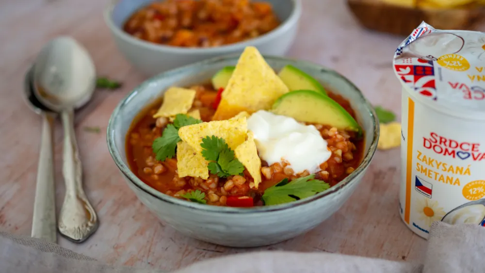 - K podávání: zakysaná smetana, avokádo, koriandr, tortilla chipsy