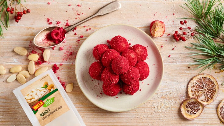 Lyofilizované maliny rozdrťte na prach a kuličky v něm ze všech stran obalte.