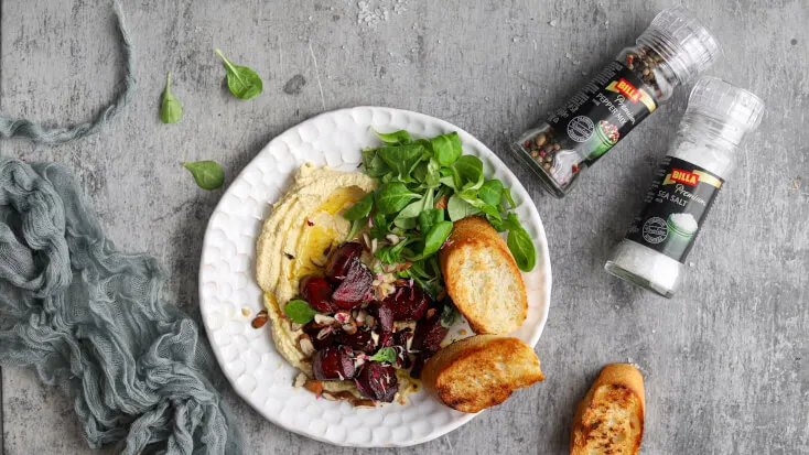 Odlehčená večeře nebo pořádná svačina? Vyzkoušejte pečenou červenou řepu s humusem. Hotovo budete mít během chvilky a zaručeně si pochutnáte. Servírujte s čerstvým pečivem, mandlemi a polníčkem.