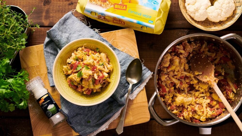 1Krok 1Růžičky květáku cca 15 minut spařte v pařáčku.2Krok 2Sceďte a nechte trochu zchladnout.3Krok 3Papriky zbavte semínek a spolu s rajčaty nakrájejte na kostičky.4Krok 4Na másle orestujte cibuli nakrájenou najemno, hezky dosklovata a lehce dozlatova.5Krok 5Přidejte papriku, rajčata a promíchejte. Poté přisypte spařený květák a krátce poduste pod pokličkou.6Krok 6Dochuťte prolisovaným česnekem a bylinkami.7Krok 7Vejce rozmíchejte v misce, dochuťte solí, pepřem a přilijte k zelenině.8Krok 8Znovu promíchejte, aby se vejce "zdrclo" a můžete podávat.