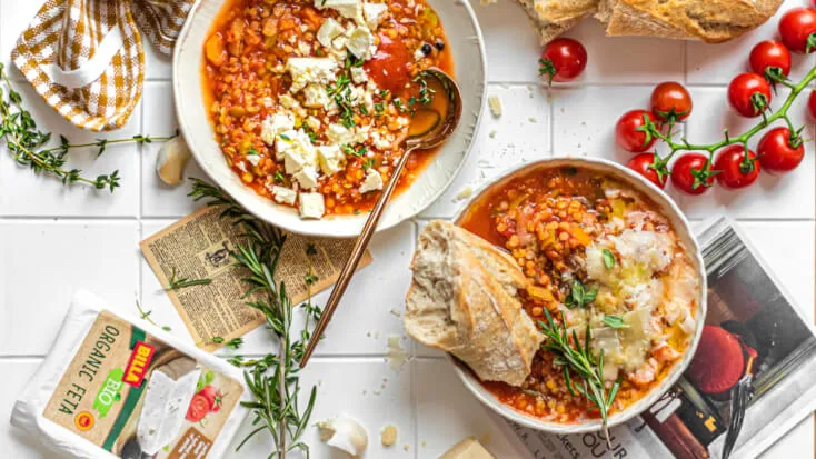 Poctivá polévka, která opravdu zahřeje. Věříme, že taková jídla vás vždy potěší, obzvlášť během zimních měsíců. Vyzkoušejte tentokrát rajčatovou polévkou, kterou vylepšete červenou čočkou, bylinkami a sýrem feta.