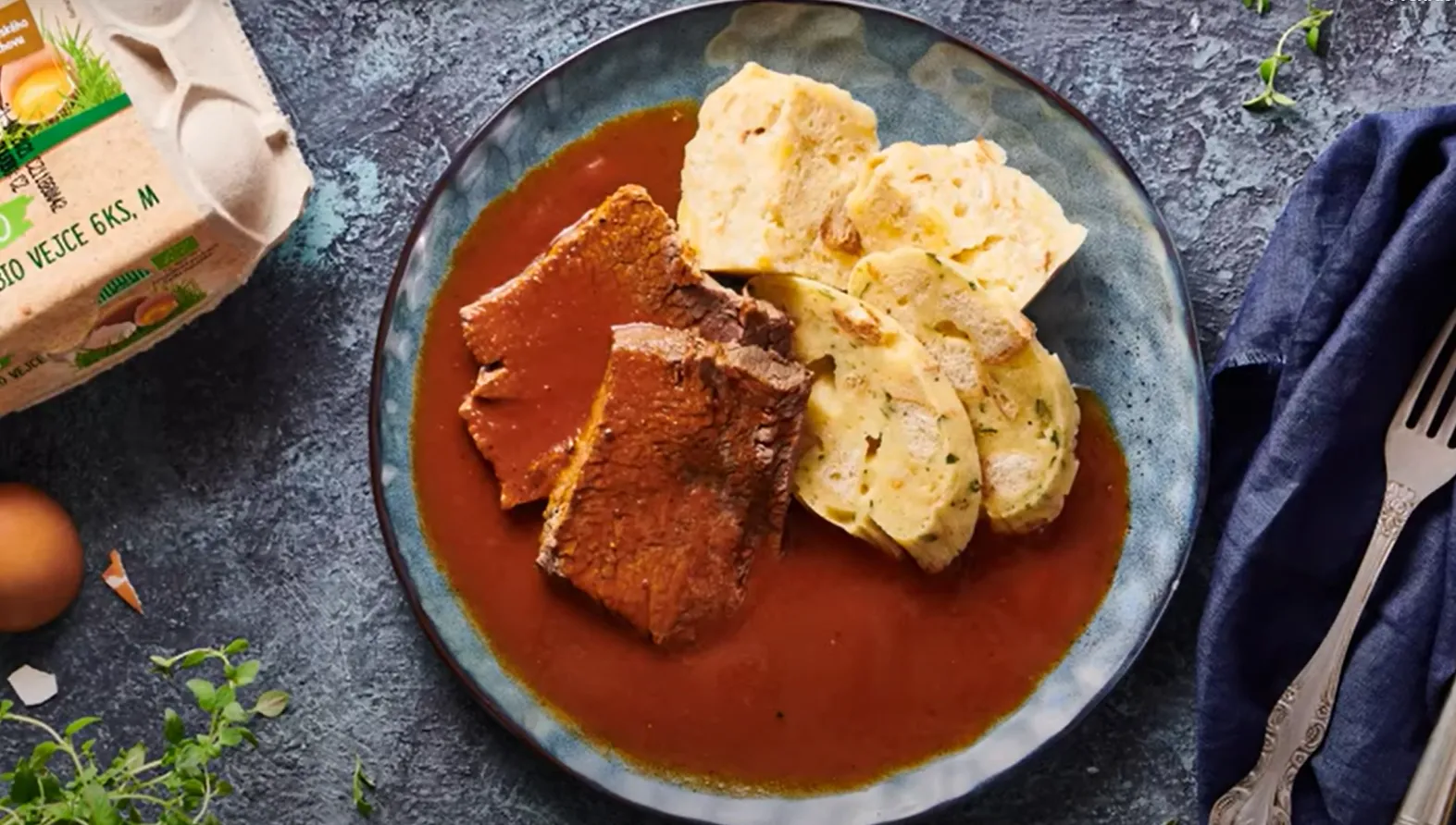 Hovězí maso nakrájené na plátky servírujte zalité rajskou omáčkou a přidejte domácí knedlíky.