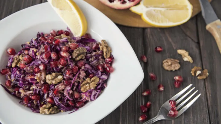 Salát z červeného zelí s granátovým jablkem a vlašskými ořechy