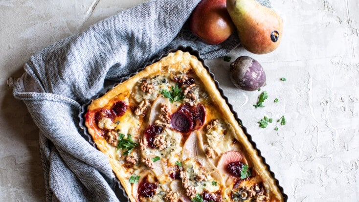 Popularita slaných koláčů neustále stoupá! Vyzkoušejte náš tip na zeleninovo-ovocný koláč se sýrem, stojí za to! Suroviny vám vystačí na dva koláče, které spolehlivě nasytí 4 lidí, případně i 6. Pokud budete koláč připravovat jako pohoštění na oslavu, vystačí vám pro jednou tolik lidí.