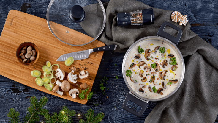 Ke štědrovečerní večeři se v českých domácnostech většinou servíruje rybí nebo hrachová polévka. Pokud nejste zrovna příznivci těchto dvou polévek nebo chcete vyzkoušet něco nového, vsaďte na naši krémovou houbovou polévku s žampiony.