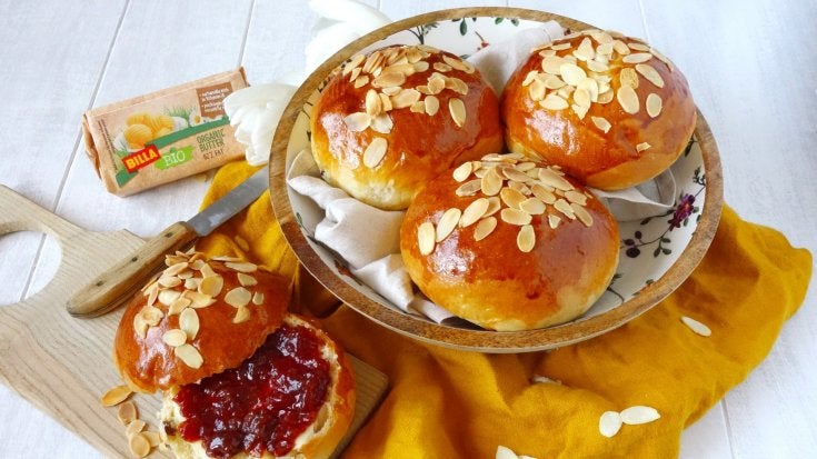 - 5Krok 5Mezitím rozpálíme troubu na 175 °C, bochánky potřeme pomocí mašlovačky rozkvedlaným žloutkem s lžící mléka a posypeme plátky mandlí.