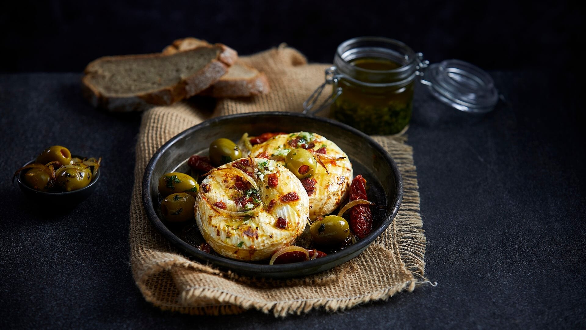 Hotový hermelín položte na talíř, posypte směsí sušených rajčat s olivami a zakápněte bazalkovým pestem.