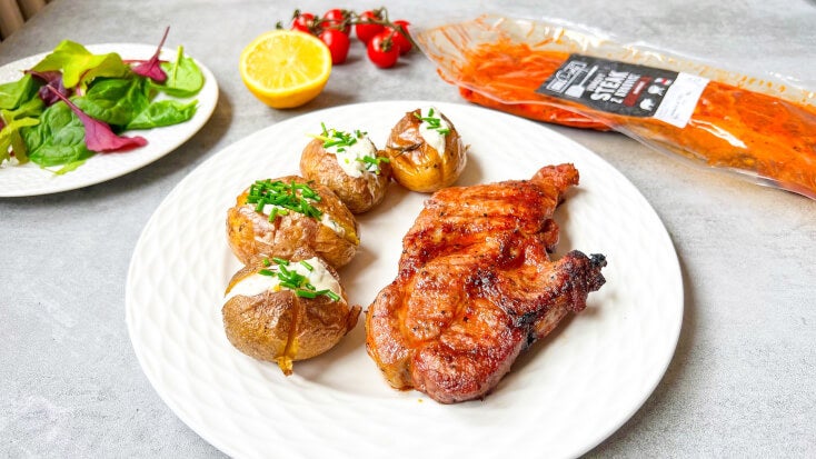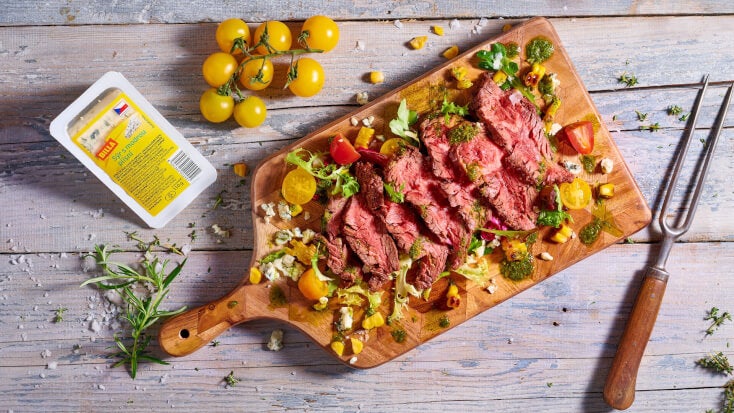 Grilovaný hanger steak se salátem, grilovanou kukuřicí a bylinkovou omáčkou