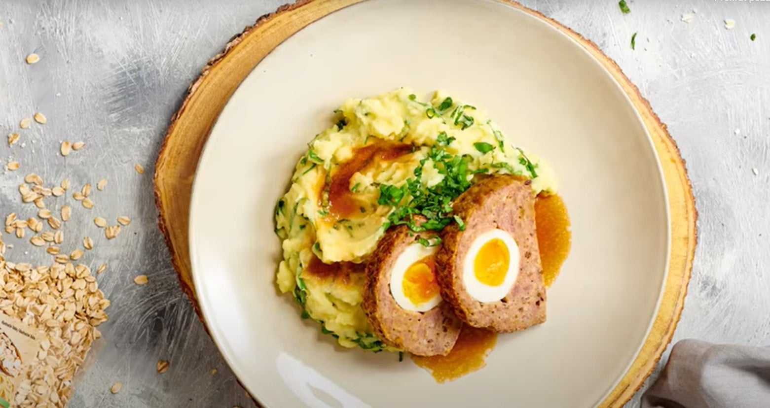 Sekaná s vajíčkem a bazalkovou bramborovou kaší