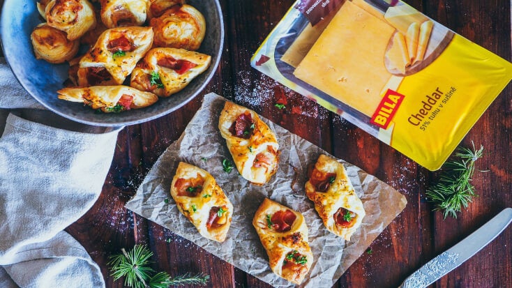Závitky z listového těsta s cheddarem, prosciuttem a karamelizovanou cibulkou