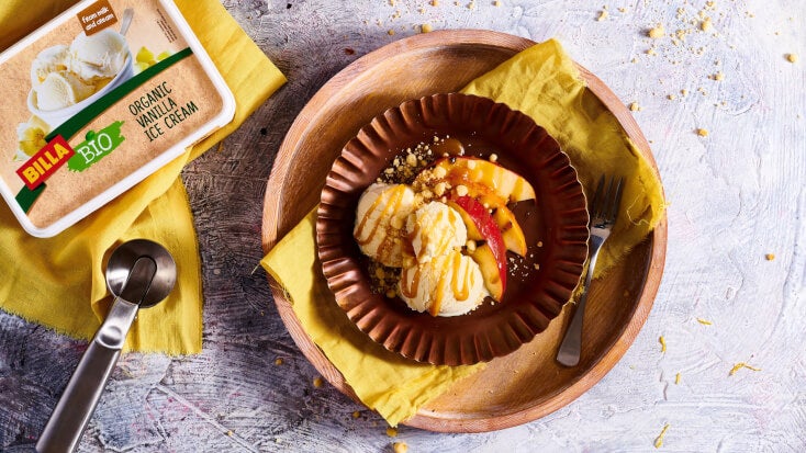 Grilovaná jablíčka v karamelu s drobenkou a vanilkovou zmrzlinou