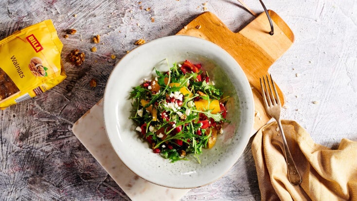 Salát z pečených paprik s vlašskými ořechy a granátovými jablky