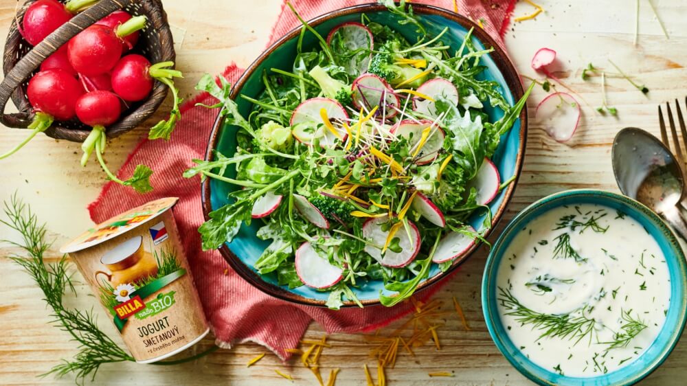 Salát s brokolicí, ředkvičkami a jogurtovým dipem