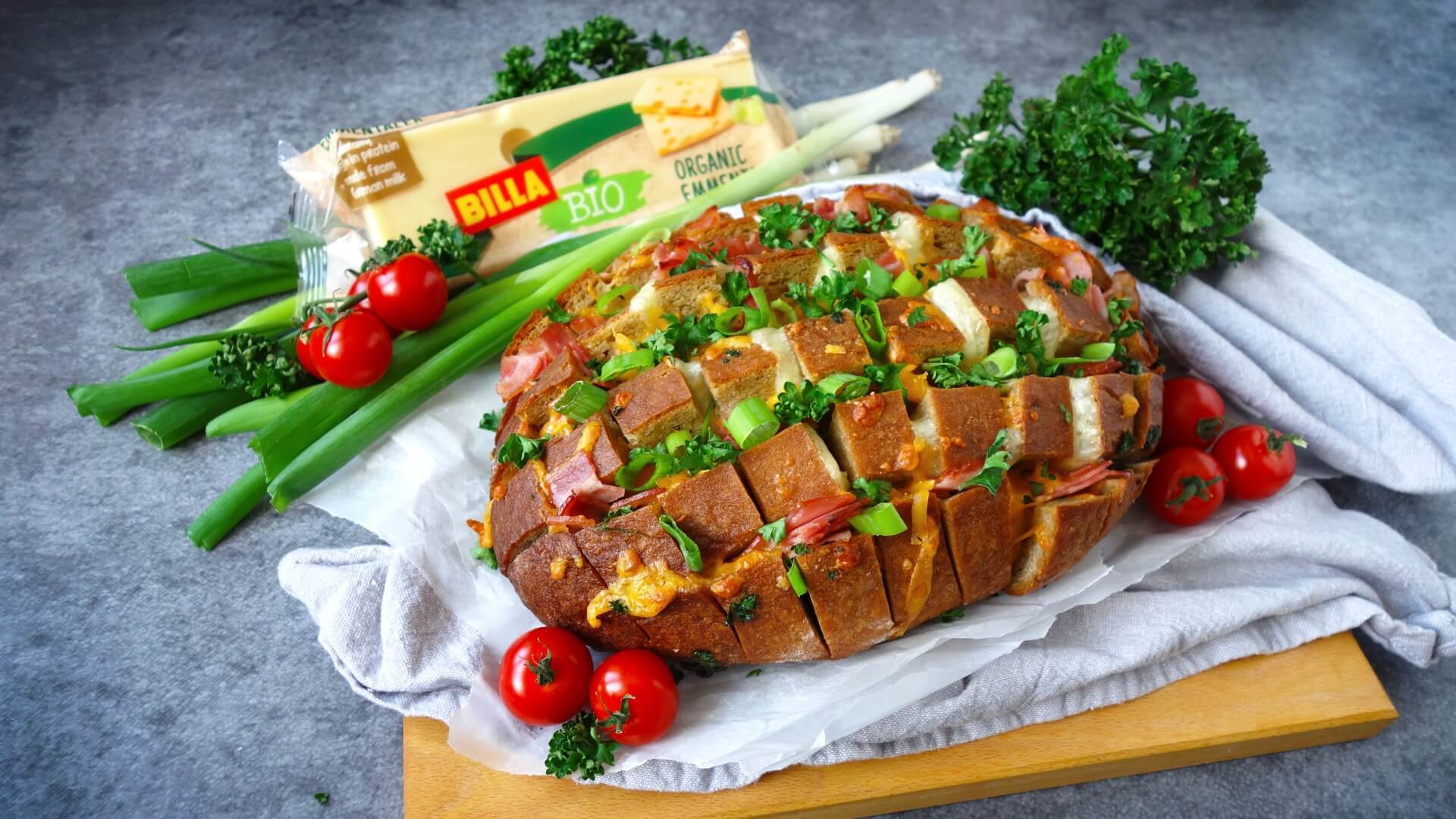 Plněný rozpečený chléb se sýrem a slaninou