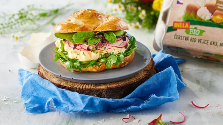 Velikonoční uzel plněný vajíčkovou pomazánkou, rukolou a ředkvičkou