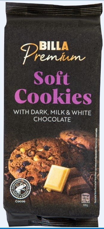 Stažení výrobku BILLA PREMIUM SOFT COOKIES WITH DARK, MILK & WHITE CHOCOLATE 210 g z prodeje