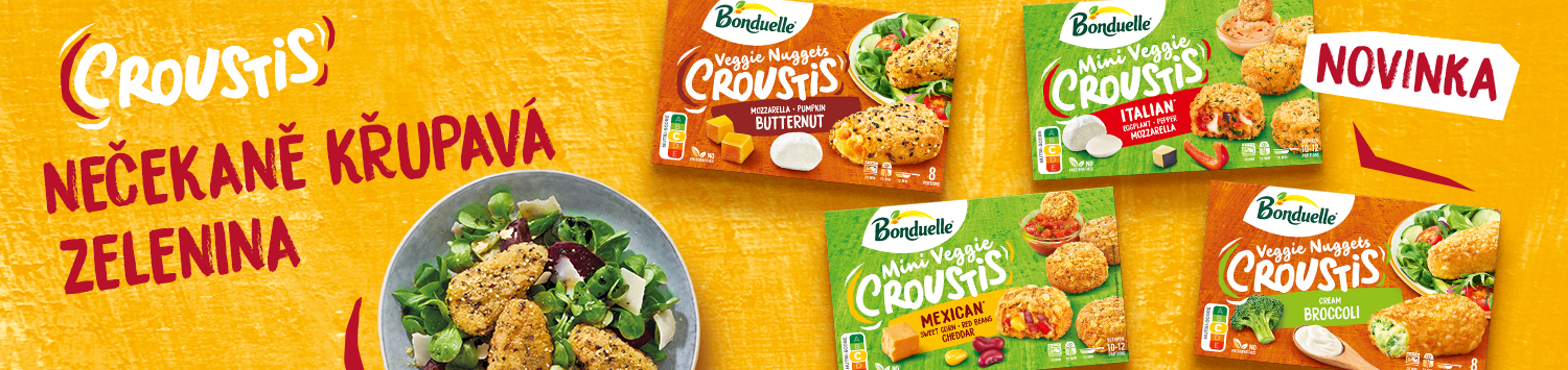 Objevte nečekaně křupavou zeleninu plnou barev a chutí, která zaručeně na vašem talíři udělá rozruch! Zeleninové nugetky Croustis jsou spojení velkých kousků lahodné zeleniny, roztékajícího se sýra a křupavé strouhanky. Na oběd, na svačinu nebo třeba do vašich salátů, Croustis jsou váš nový křupavý snack bez výčitek! Ochutnejte některou ze 4 křupavých variant: dýně s mozzarellou, brokolice s čerstvým sýrem, mini nugetky à la Itálie s lilkem paprikou a mozzarellou nebo mini nugetky à la Mexiko s kukuřicí, červenými fazolemi a cheddarem.